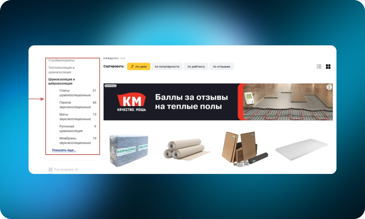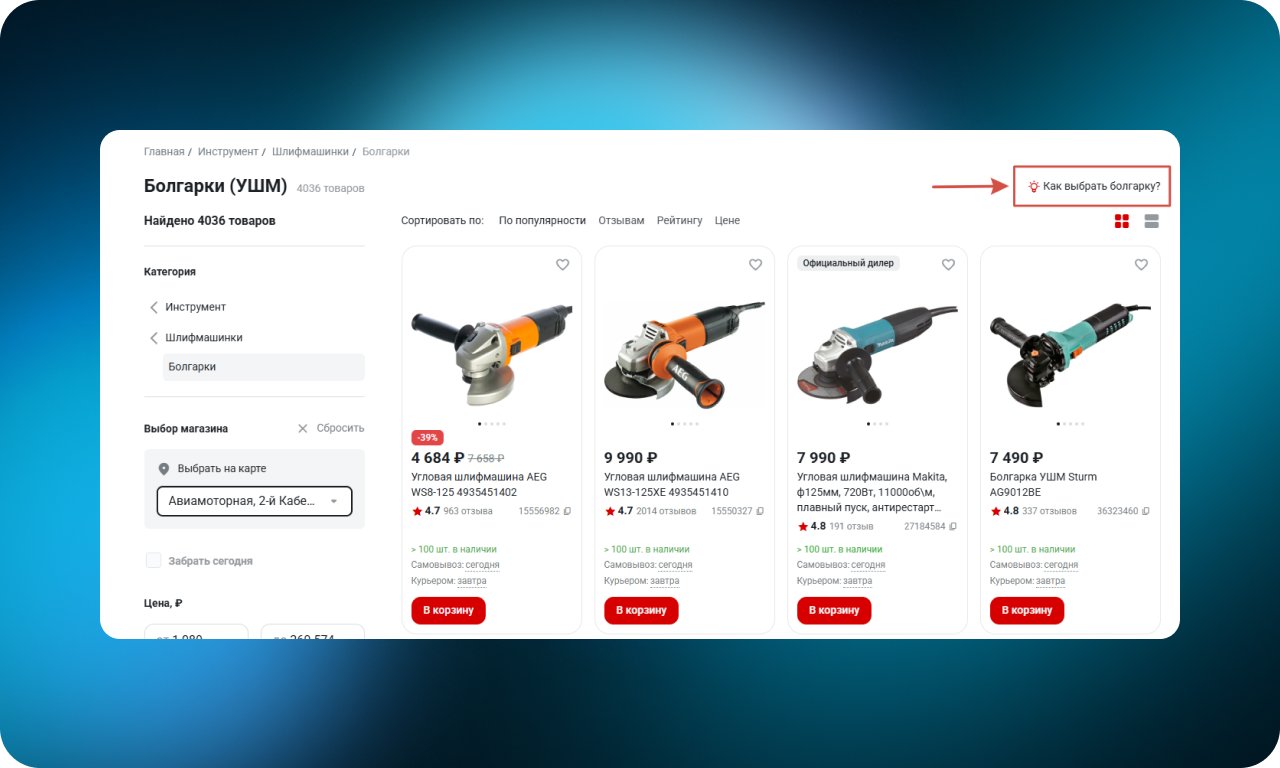 В категориях со сложными или техническими товарами размещена ссылка на гайд, статью или видео с пояснениями по выбору. Такой контент помогает разобраться в характеристиках и критериях, упрощает принятие решения и снижает нагрузку на поддержку.
