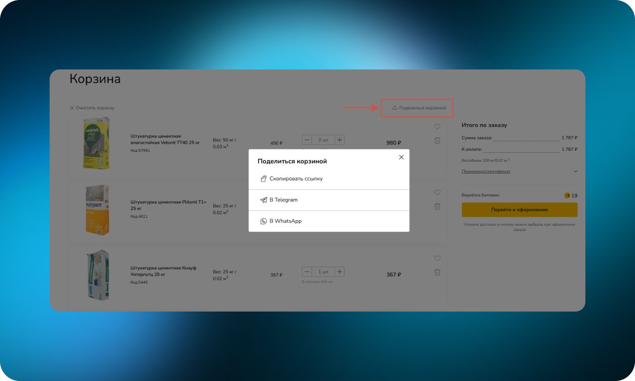 В корзине есть кнопка «Поделиться», которая формирует ссылку на текущий список товаров или отправляет его в мессенджер. Такой формат удобен для согласования покупки с коллегами, семьей или заказчиком, а также для сохранения списка на будущее.