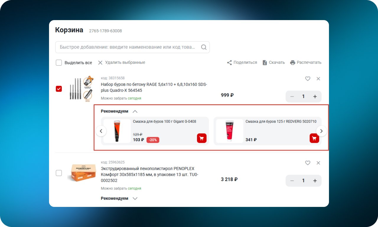 Рядом с каждой позицией в корзине отображаются рекомендации: сопутствующие товары, расходники или популярные сочетания. Пользователь видит полезные дополнения прямо в момент принятия решения, не переходя в каталог и не теряя контекст.