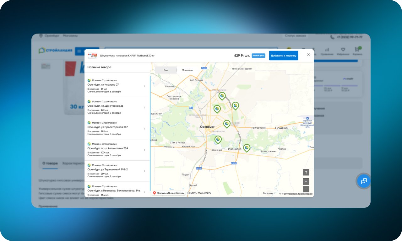 В карточке товара доступен просмотр наличия в конкретных магазинах — на интерактивной карте и в виде списка. Из этого же окна товар можно сразу добавить в корзину. Пользователь оценивает расположение, наличие и сразу переходит к покупке.
