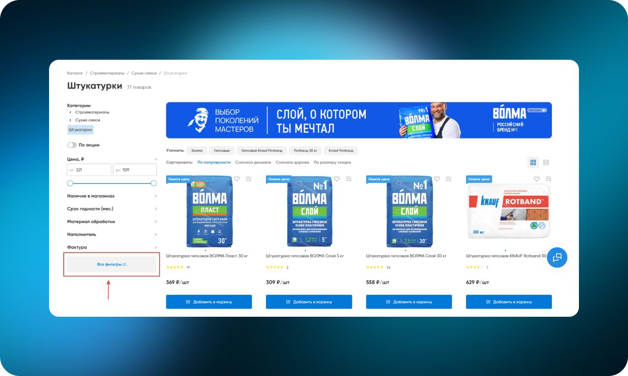 Основные и самые востребованные фильтры отображаются прямо в каталоге. Расширенные параметры вынесены в отдельную кнопку и открываются в модальном окне. Интерфейс остается чистым и не перегруженным, при этом доступ ко всем настройкам сохраняется для тех, кому нужна точная фильтрация.