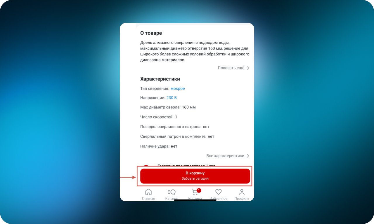 В мобильной версии карточки товара кнопка добавления в корзину закреплена в нижней части экрана и остаётся видимой при прокрутке. Пользователь может оформить покупку из любого раздела — описания, характеристик или отзывов — без возврата к началу страницы.