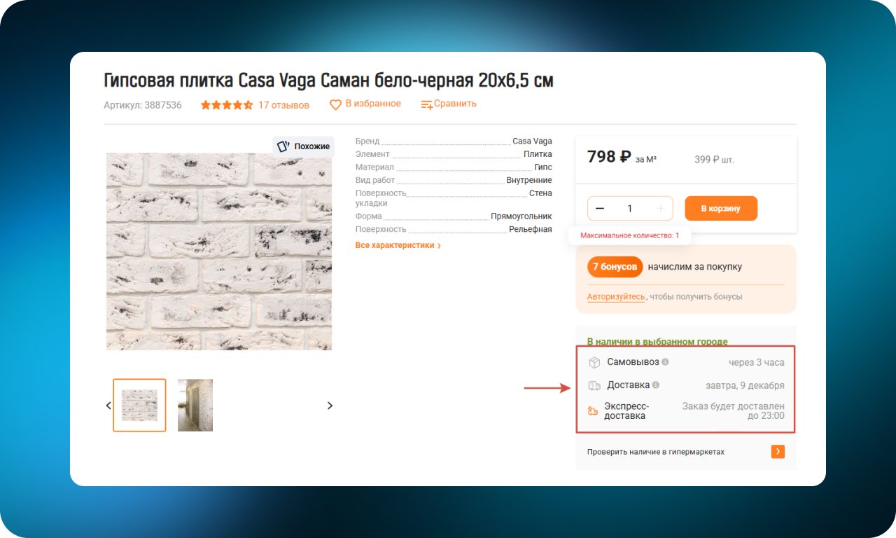 В карточке товара и при оформлении заказа указывается конкретная дата доставки, а не примерный срок. Пользователь понимает, когда именно получит заказ, и может заранее спланировать получение. Такой формат снижает неопределенность и повышает доверие к магазину.