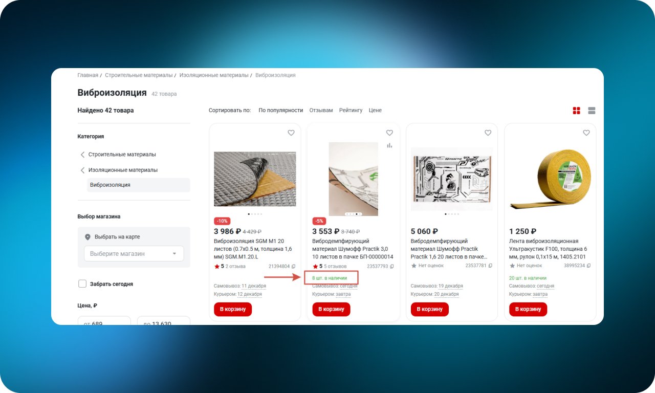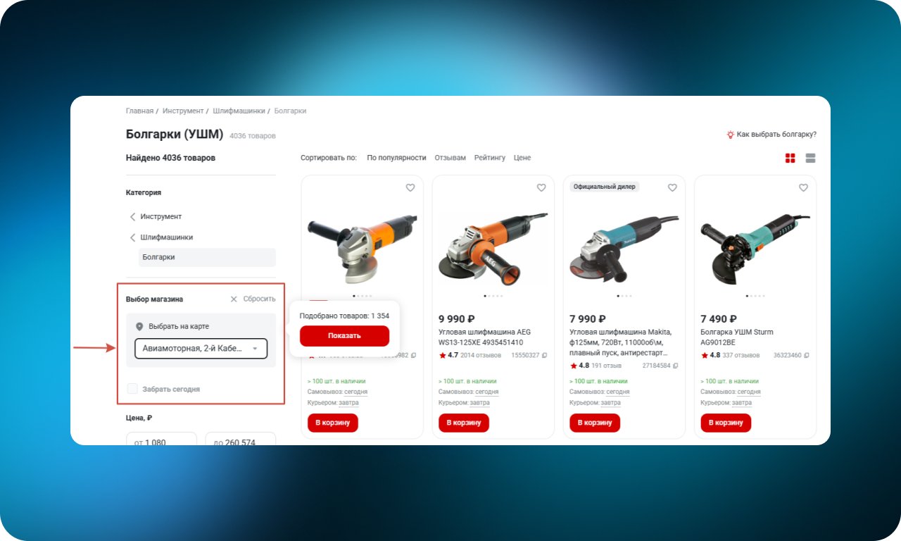Фильтр по магазину сразу показывает товары, которые есть в наличии в выбранной локации. Пользователь видит реальные остатки и не сталкивается с ситуацией, когда нужный товар недоступен при самовывозе или срочной покупке. Это упрощает планирование и экономит время на проверку наличия.