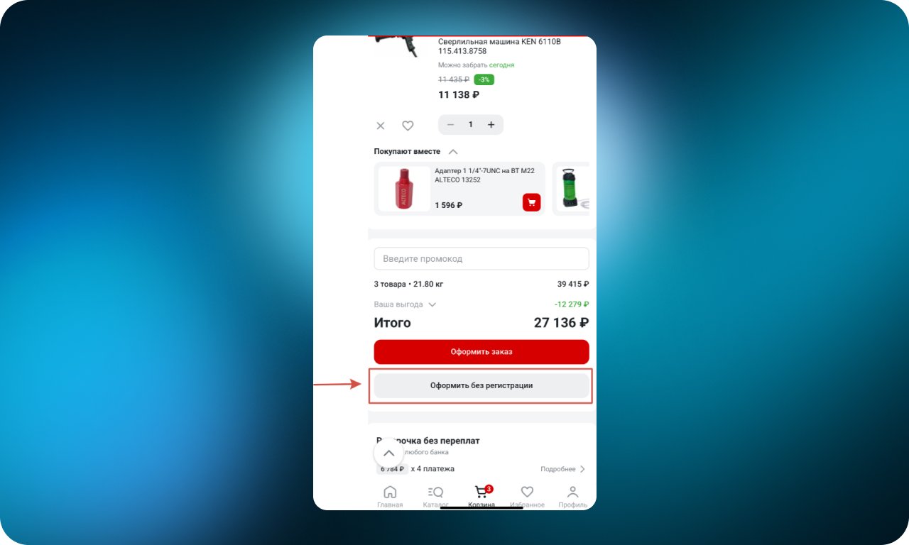 Заказ можно оформить без создания аккаунта — достаточно указать контактные данные и адрес доставки. Такой сценарий ускоряет оформление и снижает вероятность отказа со стороны новых или разовых покупателей.