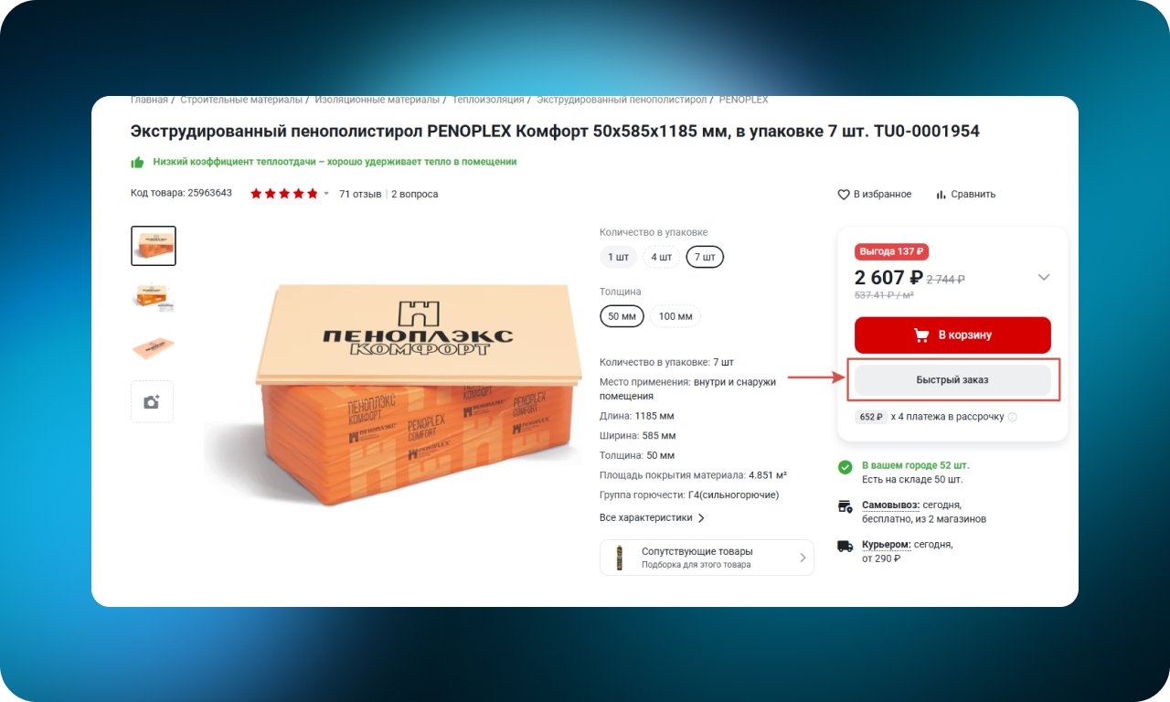Рядом с основной кнопкой добавления в корзину размещена кнопка «Быстрый заказ». При нажатии товар сразу добавляется в корзину, а пользователь переходит к оформлению. Такой сценарий сокращает путь к покупке и особенно хорошо работает для импульсивных и повторных заказов.