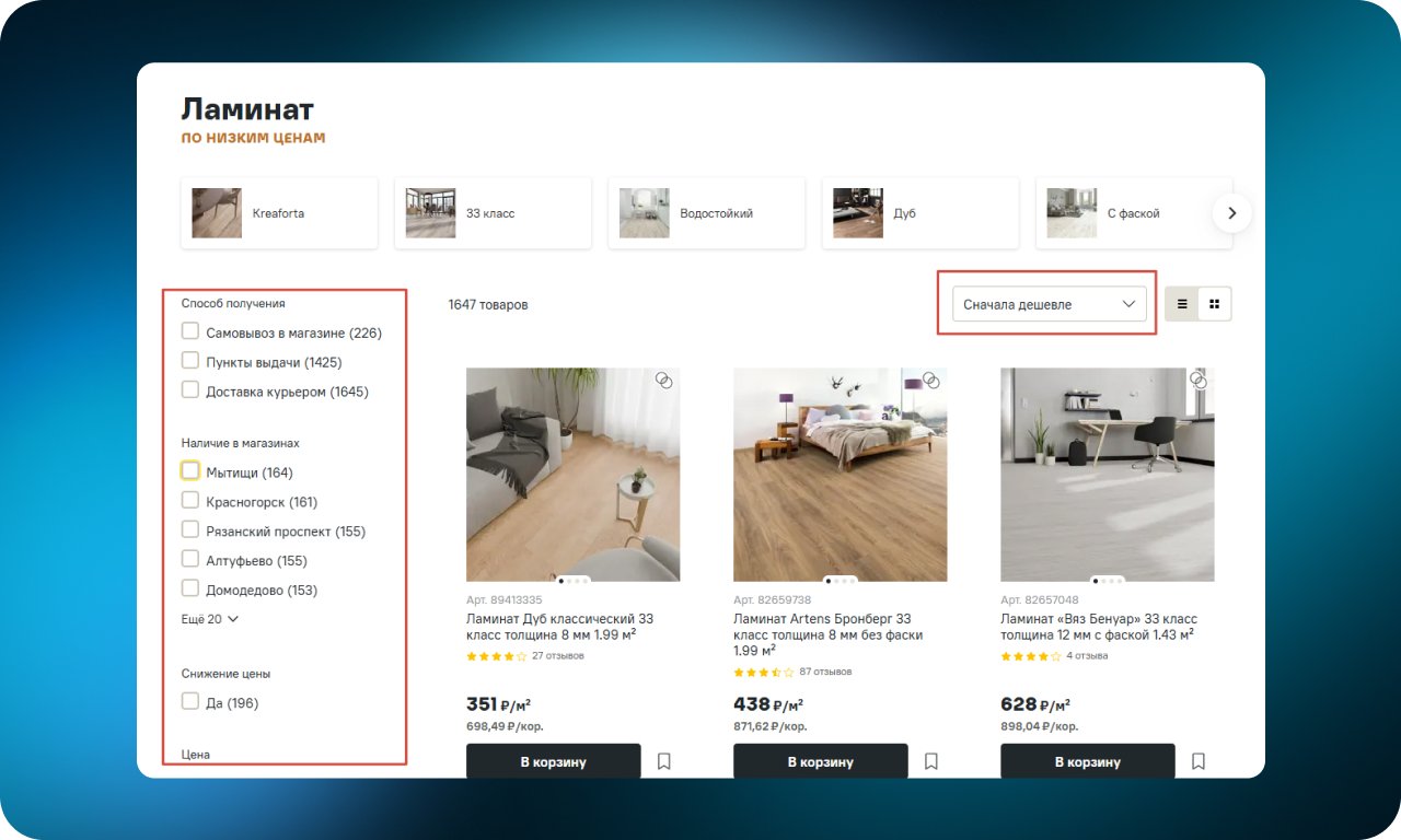 Пример реализации: https://lemanapro.ru/catalogue/laminat/