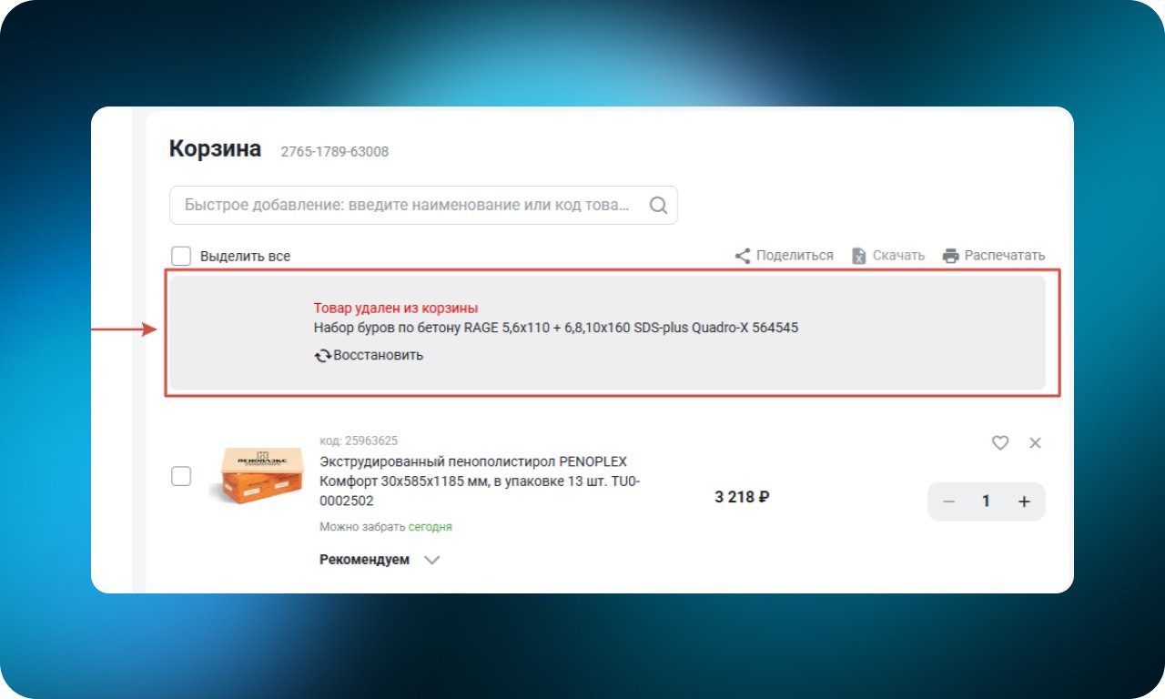 При удалении товара появляется плашка с подтверждением и возможностью отменить действие. Это защищает от случайных кликов и помогает быстро восстановить позицию, если удаление произошло по ошибке.