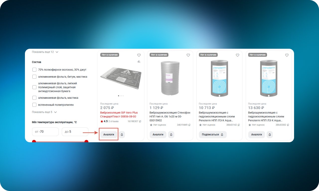 Если товара нет в наличии, в списке или карточке отображается кнопка «Аналоги». Она ведет к подборке доступных позиций со схожими характеристиками или ценой. Пользователь не упирается в тупик и продолжает выбор, оставаясь на сайте.