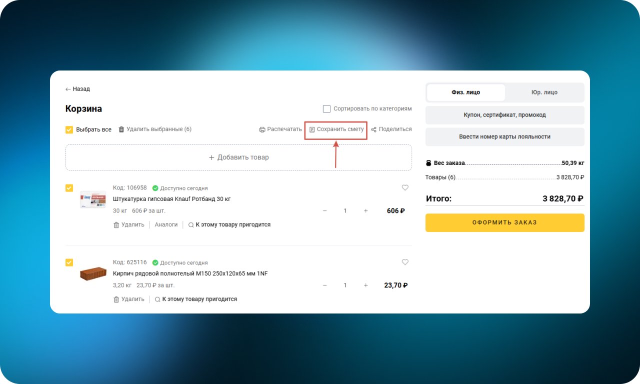 В корзине доступна функция сохранения выбранных товаров в виде сметы. Пользователь может дать ей имя и вернуться к этому набору позже — со всеми позициями, ценами и конфигурациями.