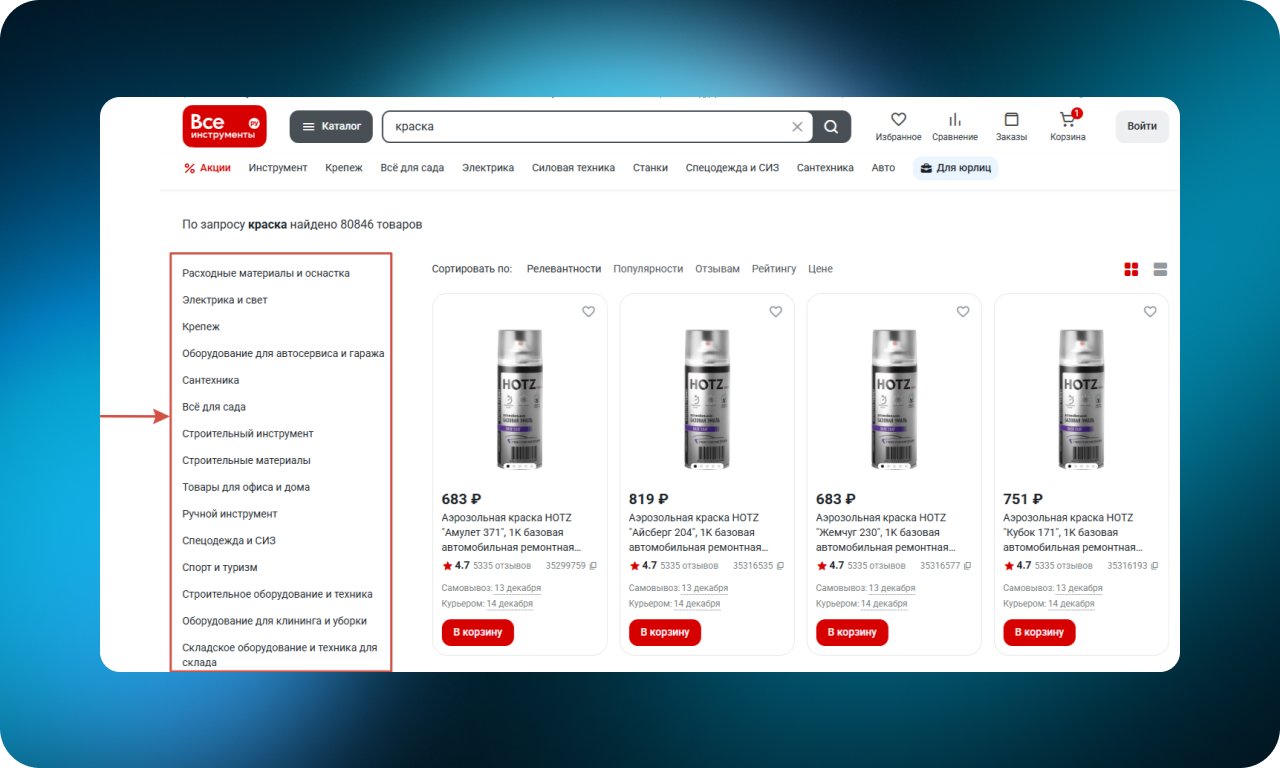 Поисковая выдача сразу разделена по категориям. Пользователь быстрее понимает, где находится нужный товар, и не тратит время на просмотр нерелевантных позиций. Такое решение особенно заметно работает в каталогах с большим количеством товарных групп.