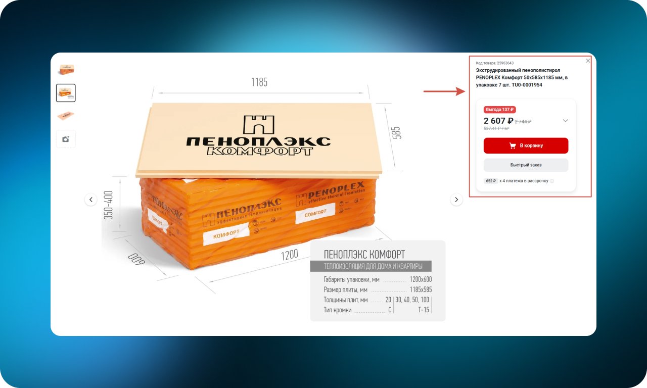 Для товаров с разной фасовкой или объёмом на странице показываются несколько вариантов цен — за штуку, упаковку, килограмм или литр. Такой формат помогает сразу оценить разницу в стоимости и выбрать оптимальный объём с учётом задачи и бюджета.