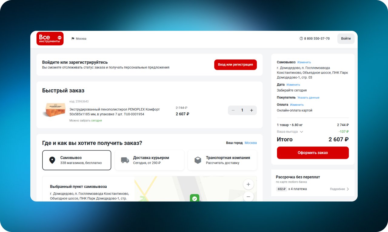 UX-решения в интернет-магазинах DIY напрямую влияют на то, как быстро покупатель ориентируется в ассортименте, понимает условия и решается на покупку. Когда поиск, фильтры, наличие и доставка работают прозрачно, пользователю не приходится сомневаться или делать лишние шаги. В такой логике даже сложный каталог перестает пугать и начинает работать на бизнес — помогая удерживать внимание, ускорять выбор и повышать конверсию.