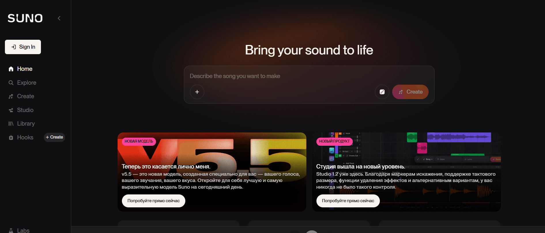 Suno — это генератор музыки, который создаёт полноценные треки: вокал, текст, мелодию, инструменты и финальный микс. Достаточно написать: «меланхоличная поп‑баллада с женским вокалом о весне» — и через 30–60 секунд готова песня. Подходит для: