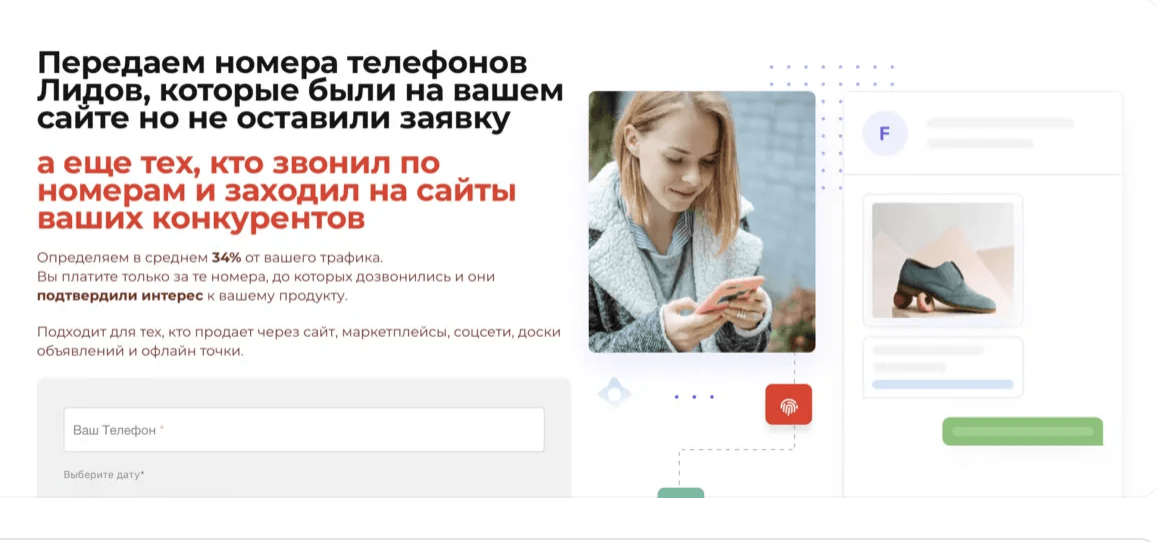 Платформа предлагает услуги по генерации и фильтрации телефонных лидов, используя пиксель, размещаемый на веб-ресурсе клиента. Данная система позволяет выявлять посетителей сайта, узнавать их телефонные номера и направлять эти сведения для осуществления звонка. Ключевое достоинство сервиса заключается в оплате исключительно за те контакты, которые были подтверждены оператором.