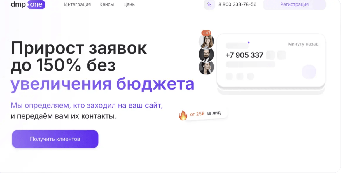 2. DMP.ONE - система идентифицирует до 30% информации для связи с клиентами вашего сайта, представляющими интерес для бизнеса. При этом цена одного такого потенциального клиента начинается от 25 рублей. Наличие собственного колл-центра позволяет осуществлять обзвон «холодных» контактов, передавая вам только заинтересованных в сотрудничестве клиентов. В качестве бонуса при регистрации вы получаете 40 бесплатных лидов для ознакомления с сервисом.
