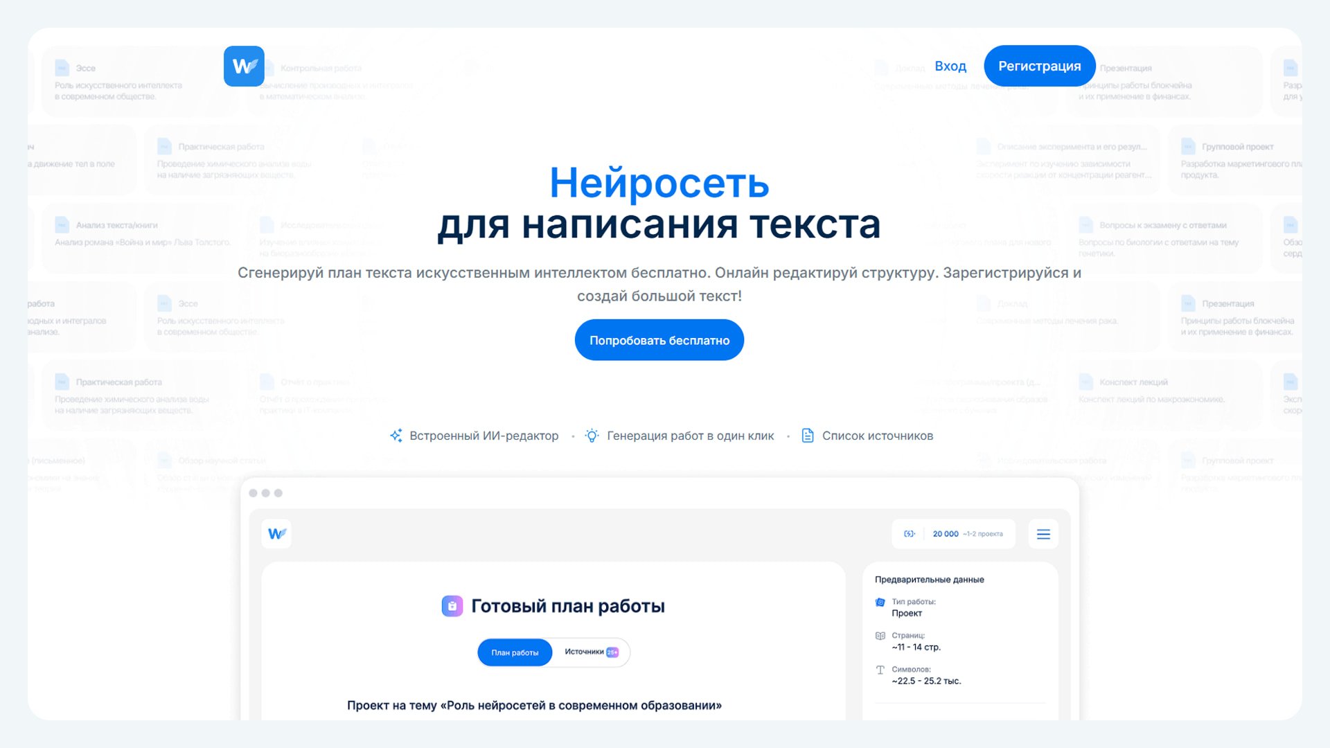 Поддерживает много учебных дисциплин, а размер текстов по одному запросу варьируется от 2000 до 8000 слов.