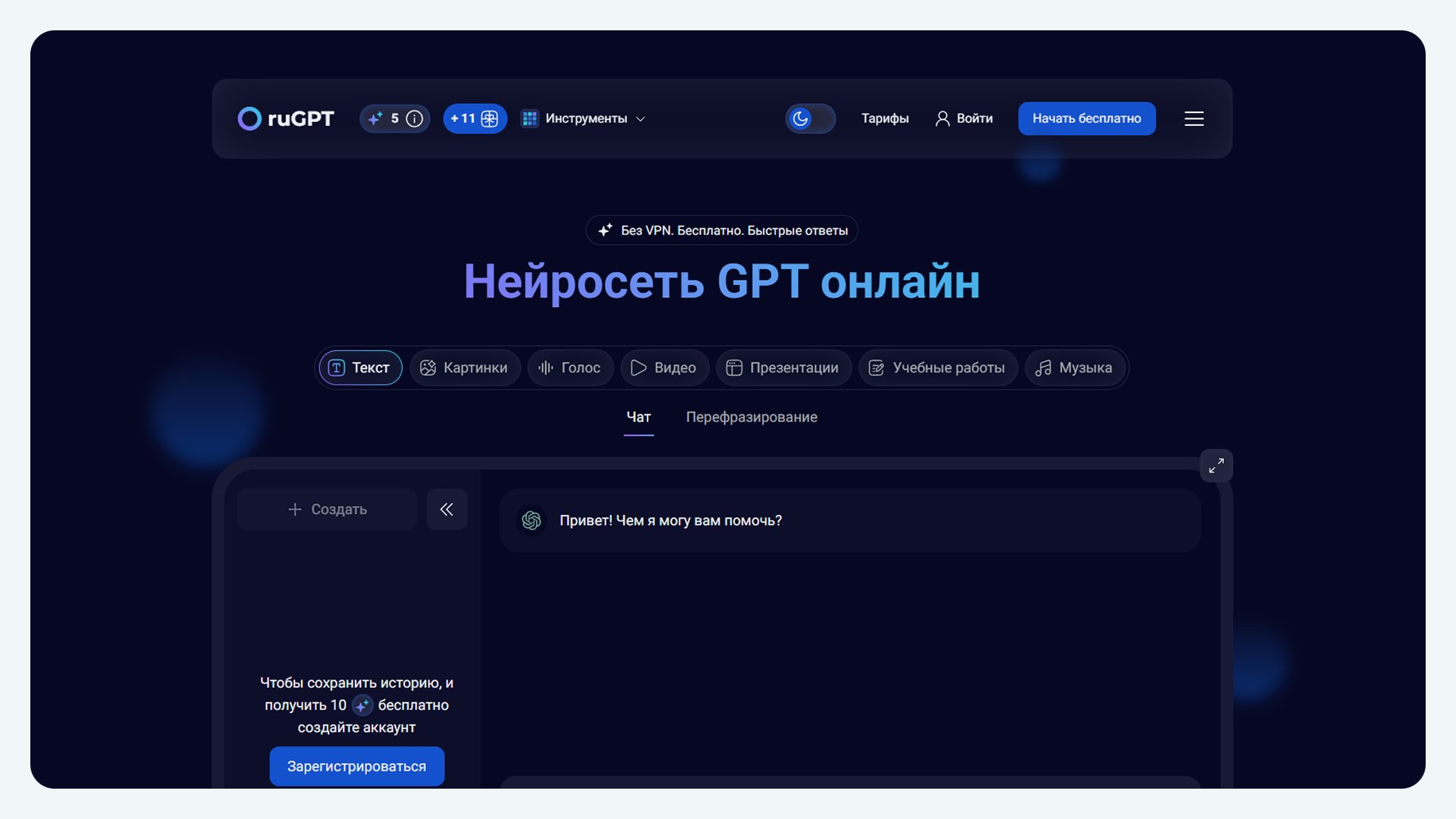 Онлайн-платформа, которая подходит для генерации различных типов текстов, в частности с ней намного проще сделать доклад онлайн бесплатно нейросетью по пробному тарифу.