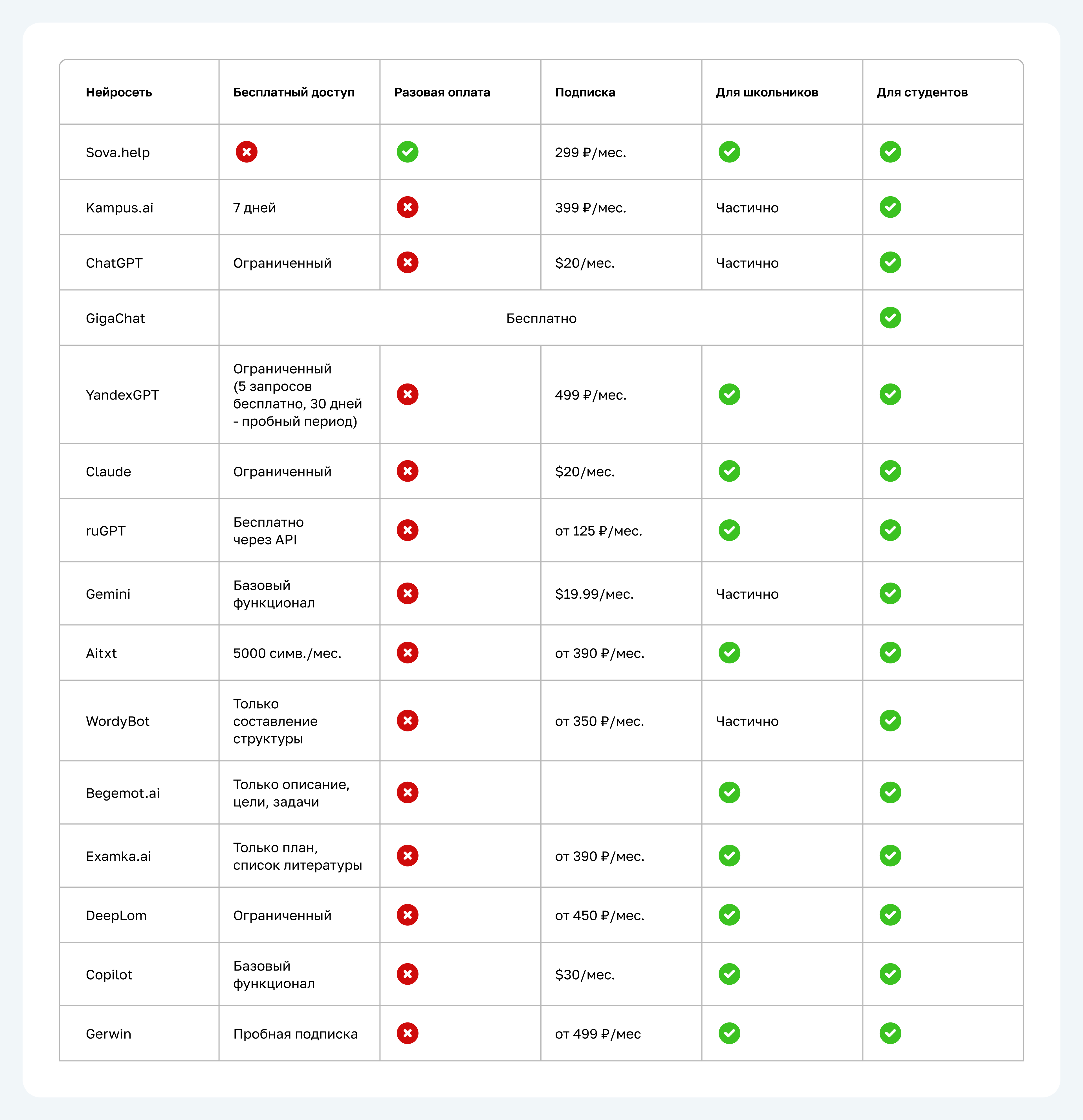 Теперь, когда вы знаете, как написать доклад с помощью нейросети бесплатно или по платному тарифу, выбор подходящего AI-помощника должен основываться на ваших конкретных потребностях и требованиях к работе, которую нужно подготовить. Из рассмотренных сервисов выделим следующие: