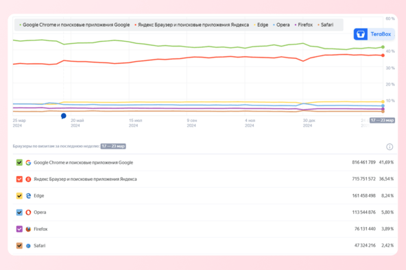 По данным StatCounter, на начало 2025 года доля браузеров распределена следующим образом: