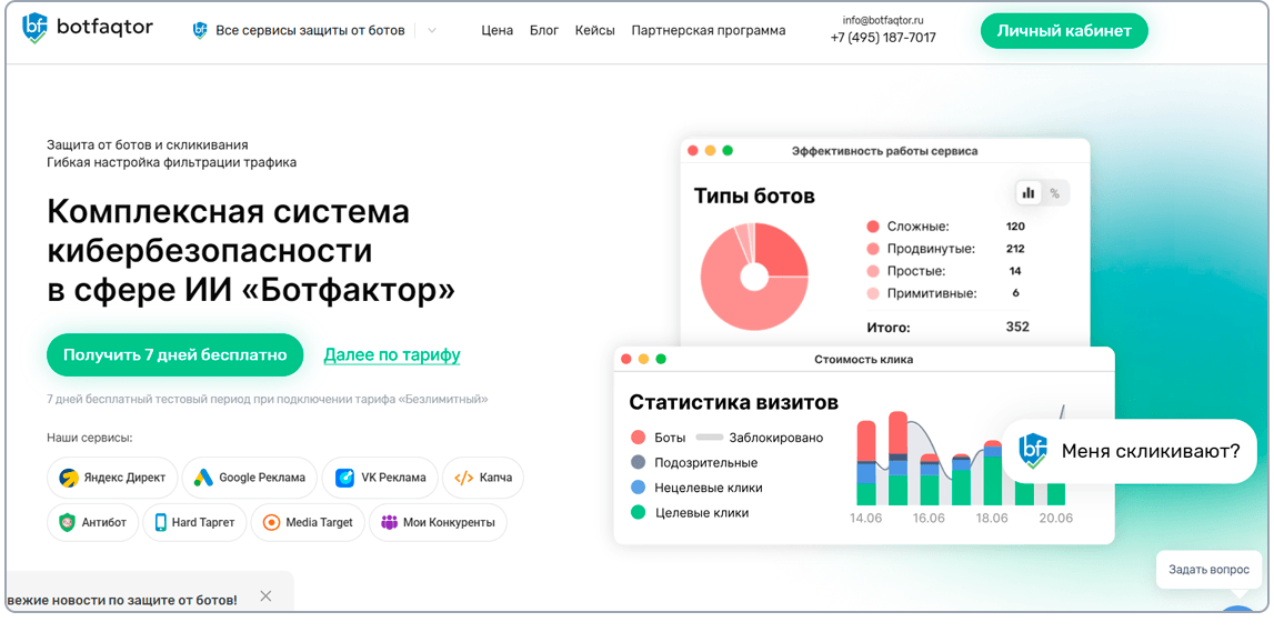 Комплексный сервис с инструментами защиты от скликивания сразу для трех рекламных платформ: Яндекс Директ, Google Ads, VK Реклама. В алгоритмах обнаружения и блокировки используются ИИ и машинное обучение.