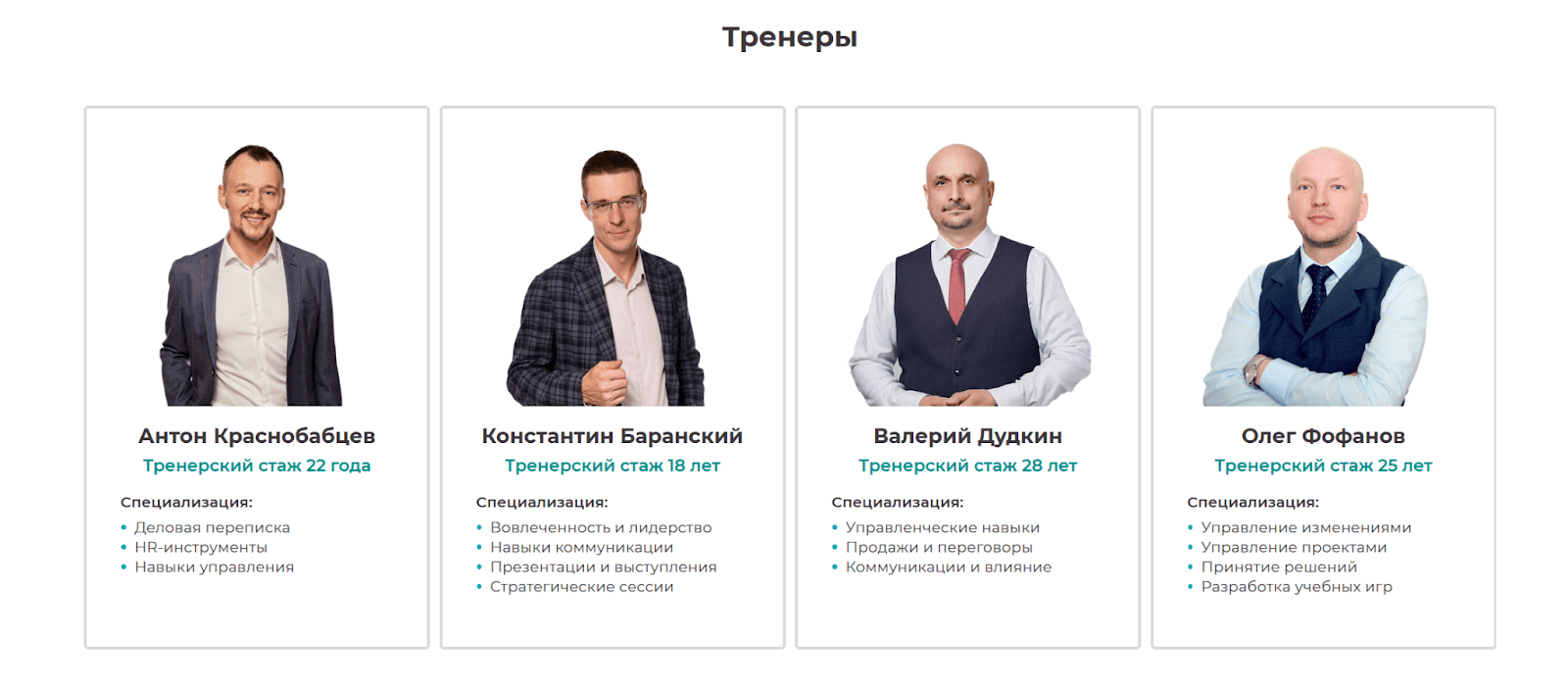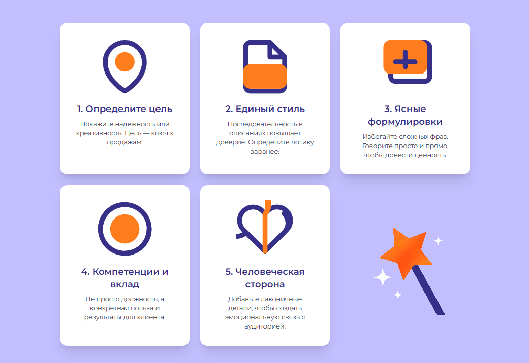 Особое внимание наша LZ-команда советует уделять первому предложению в описании каждого эксперта и общей фразе в шапке раздела (подзаголовок). Именно эти акценты задают общий тон восприятию страницы. Если начать с лишних деталей или шаблонных слов, внимание пользователя рассеется. Гораздо продуктивнее обозначить ключевую компетенцию или сферу ответственности. Такой прием помогает быстро донести важное и показать ценность специалиста для клиента, к тому же четкие формулировки экономят время читателя и делают текст убедительным.