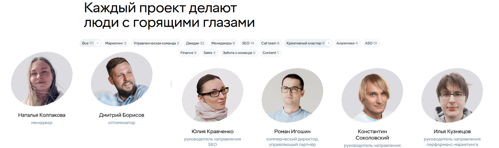 Также подумайте, какое впечатление (или ассоциации) вы хотите оставить у пользователей этим разделом. Ощущение структурированности процессов и стабильности, атмосфера свободы и генерации идей и так далее. Так вы поймете, какие факты включать в описание команды: профильное образование, кейсы с цифрами по проектам, личные интересы, отношение к работе, любимые шутки и пр. Если задача сформулирована правильно, текст будет работать и усиливать общее позиционирование компании.