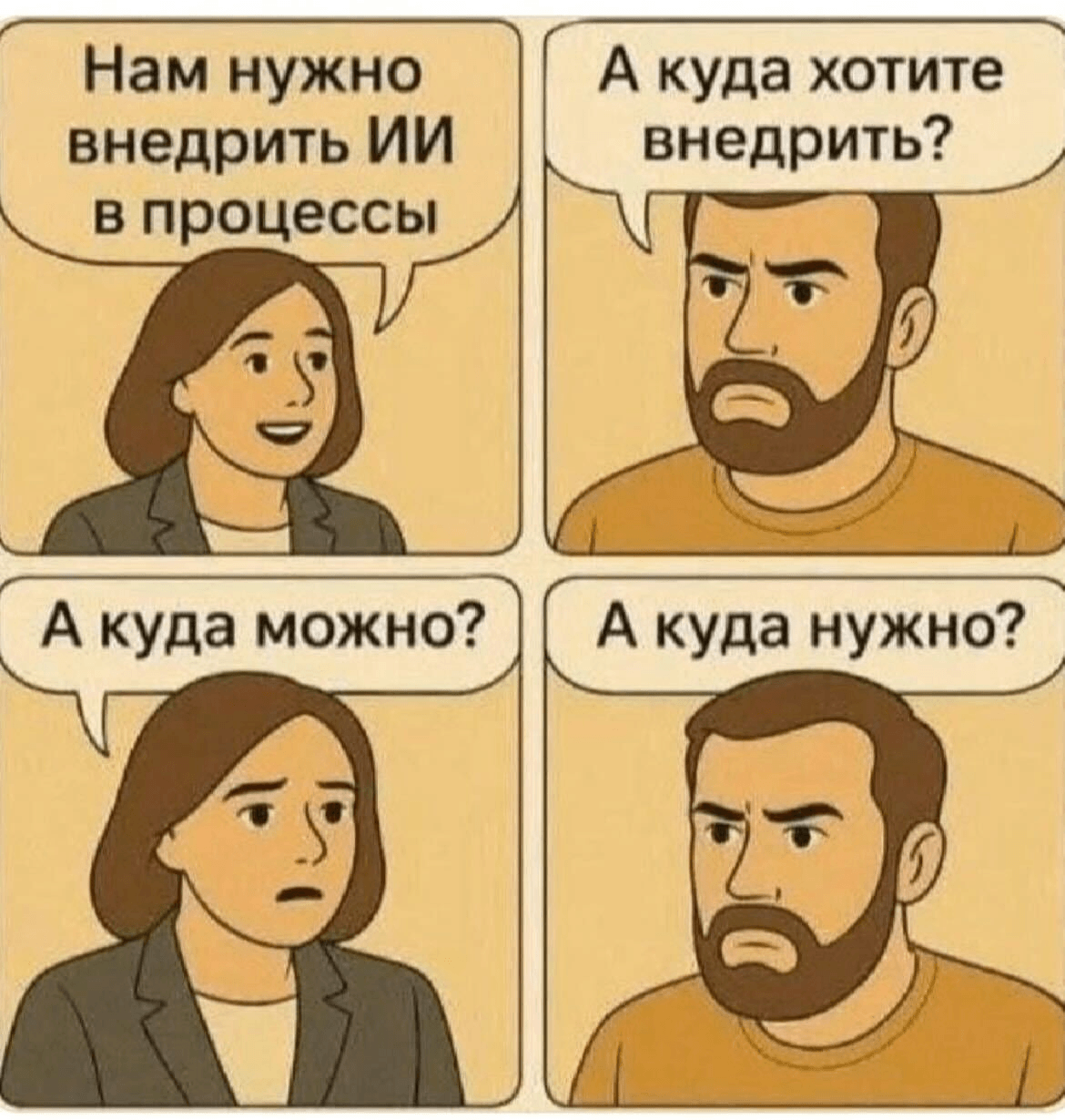 Фокус на конкретной боли, а не на "а давайте попробуем AI". Как в меме из интернетов: