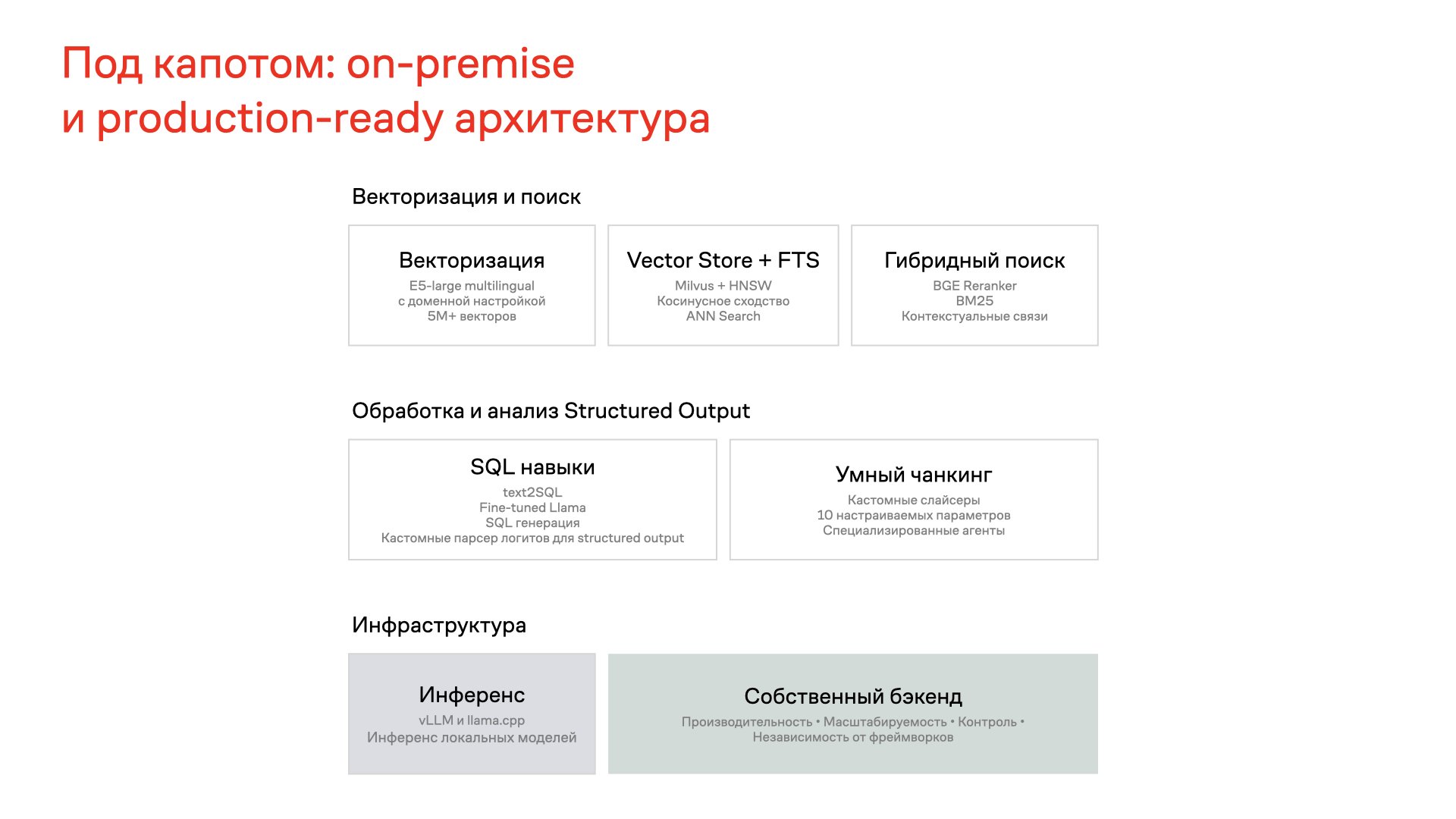 Для измерения точности использовали RAGAS и Structured Output, всё по последней ИИ-моде, если интересна эта тема, то можете почитать мою недавнюю статью в блоге Аспирити там про то, как мы работаем с ответами при создании ИИ-агентов. А мы погнали дальше