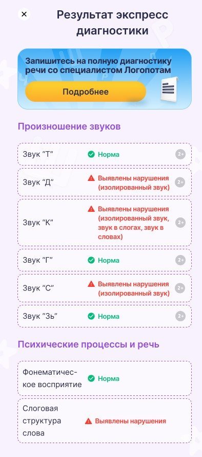 Виртуальная диагностика от «Логопотам» — это не только игра для ребёнка, а серьезный инструмент для оценки речевого развития. Приложение помогает выявить множество речевых нарушений на ранних стадиях, что особенно важно для своевременной коррекции.