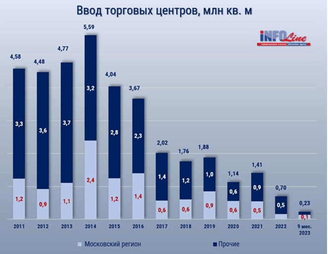 Важную роль омниканальности в современных ТЦ подтверждают данные аналитической компании INFOLine. 2023 год оказался самым сложным для отрасли за последние несколько лет: в течение первых трех кварталов было введено в эксплуатацию всего девять торговых центров общей площадью 233 тысячи квадратных метров.