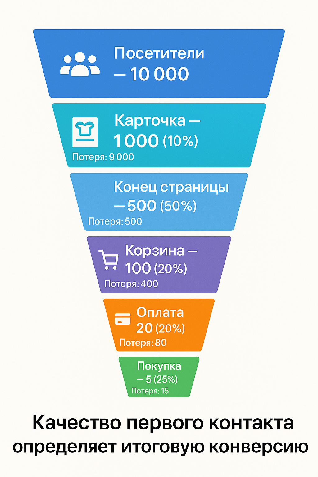 Анализ этих шагов позволяет понять, где именно аудитория теряет интерес. Читает описание товара, но не добавляет его в корзину? Значит проблема в информации, которой не хватает для решения. Отправляет товар в корзину, но не переходит к оплате? Проблема в доставке, кассовом шаге или точности интерфейса.