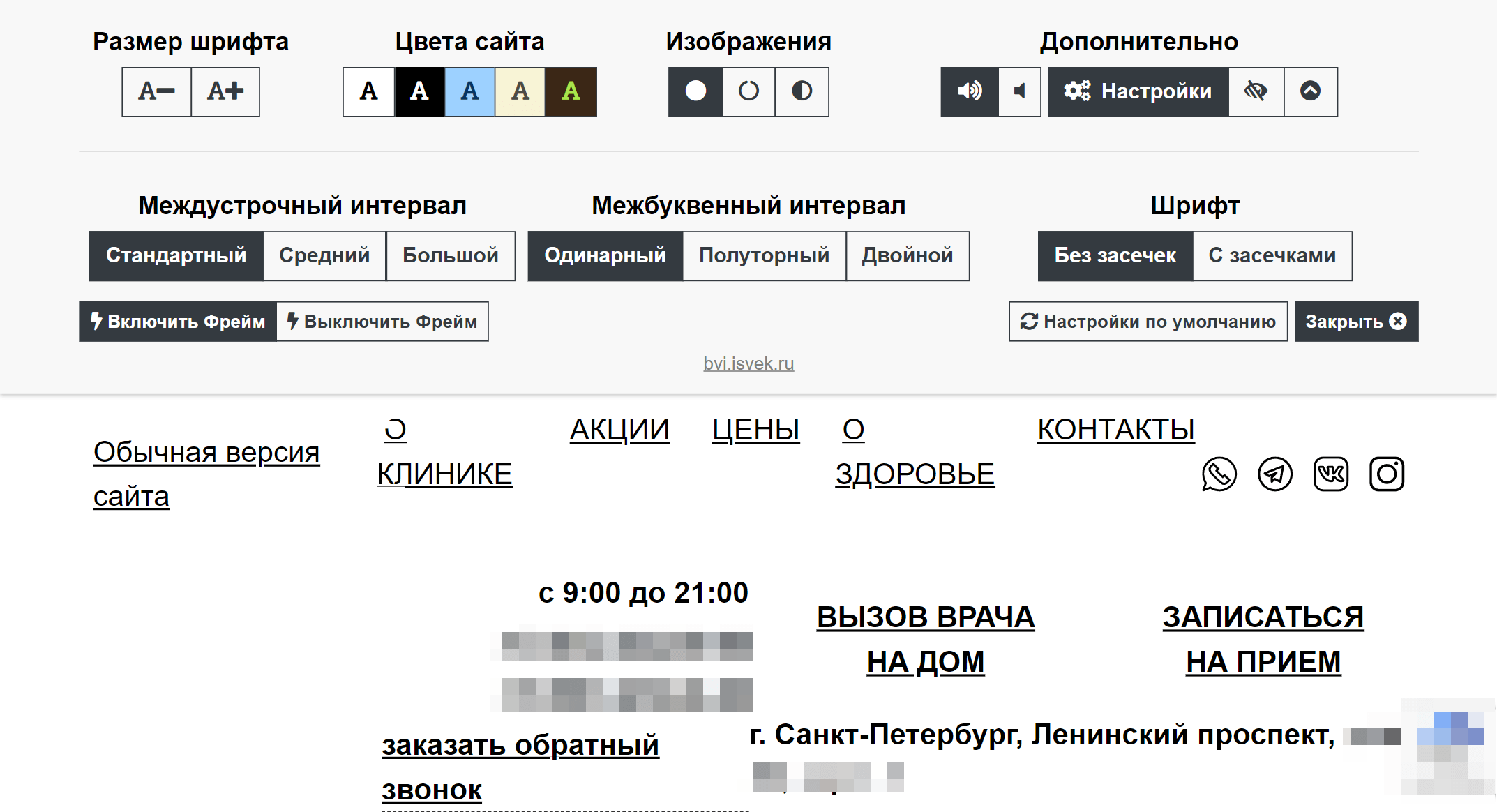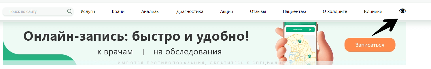 Поле настройки версии для слабовидящих на сайте клиники, которую мы внедрили на сайт