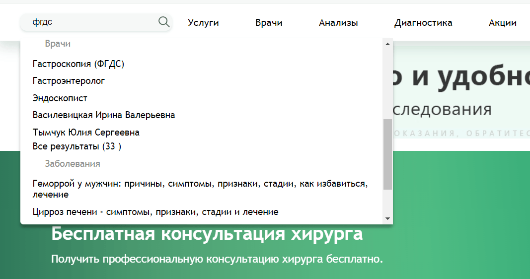 Для сайта клиники доработали поиск так, чтобы он сразу выводил результаты и показывал страницы, связанные с запросом