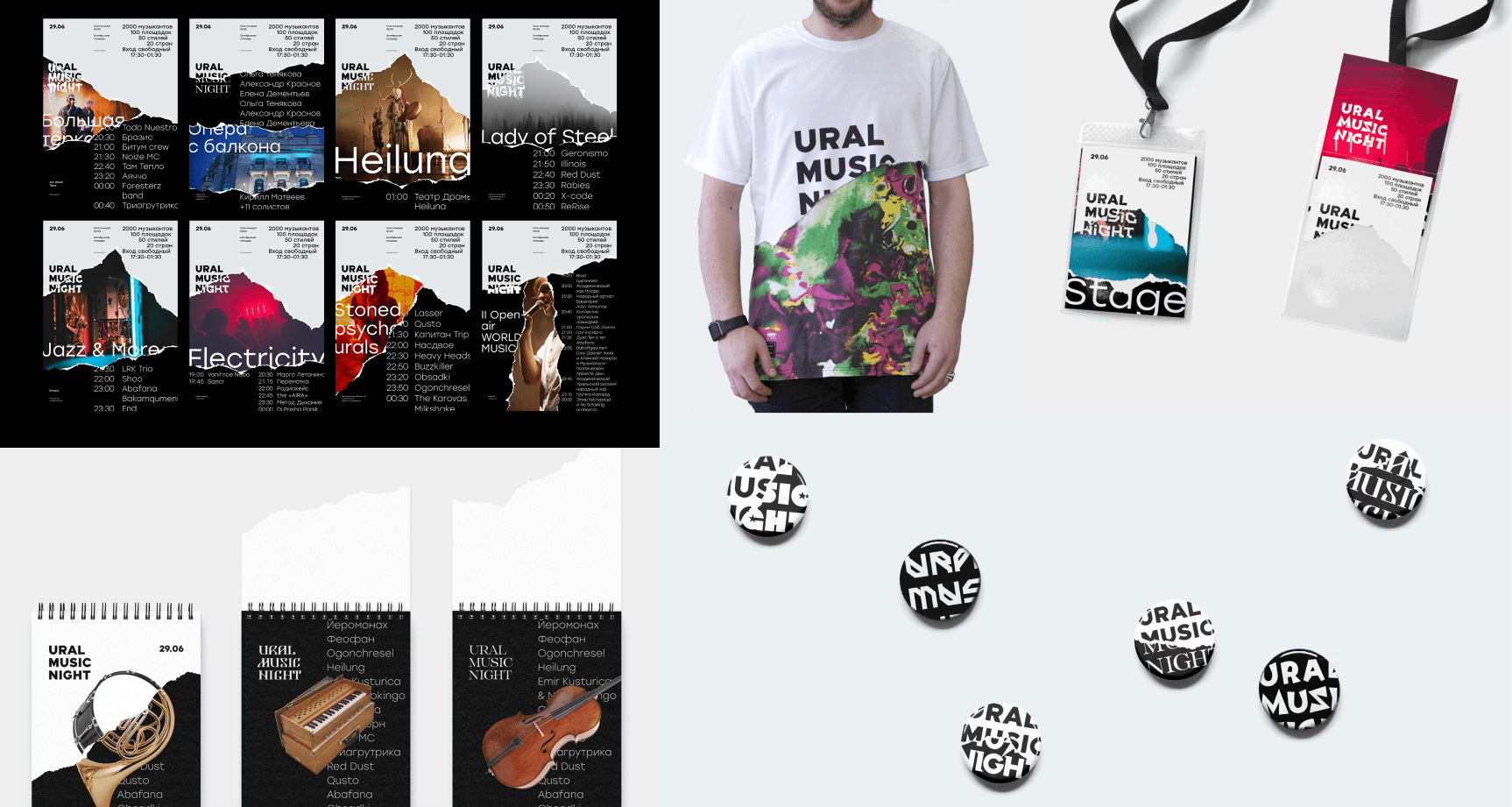 Айдентика Ural Music Festival в этом смысле создала очень яркий и масштабируемый визуальный хук — оторванные и наклеенные поверх друг друга постеры. Так создатели передали многообразие музыкантов, инструментов и жанров музыки на фесте.