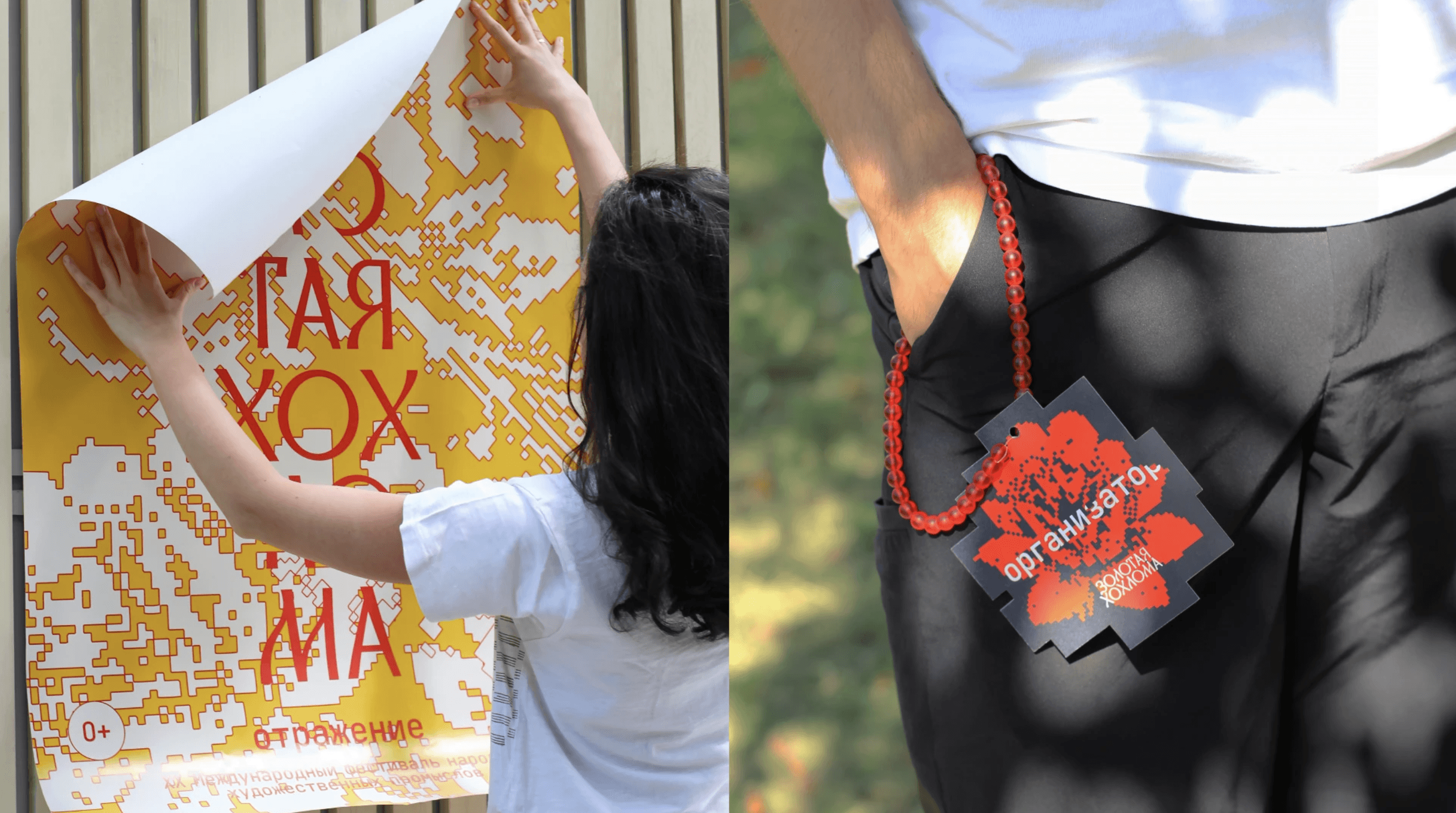 Диссонанс традиционного и современного превращается в новое интересное прочтение. И правда, это постер международного фестиваля «Золотая хохлома» в городе Семёнов. События, ключевой идеей которого было переосмысление традиционных ремёсел и их отражение в сегодняшнем дне.