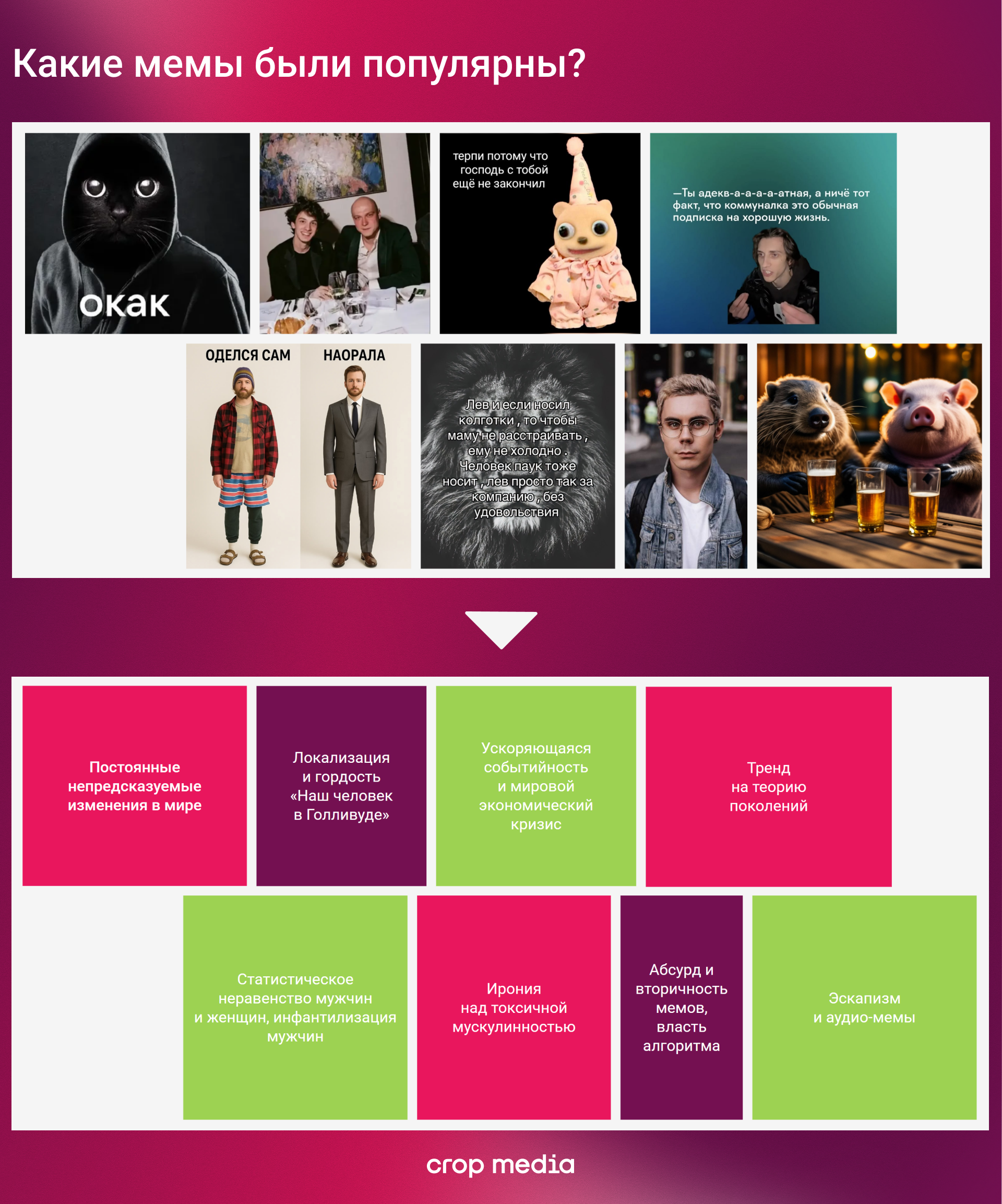 Мемы отражают, как аудитория проживает изменения. Например, экономическая нестабильность породила эскапизм, дофаминовые удовольствия и slow-living, а мемы стали способом говорить об этом с иронией.