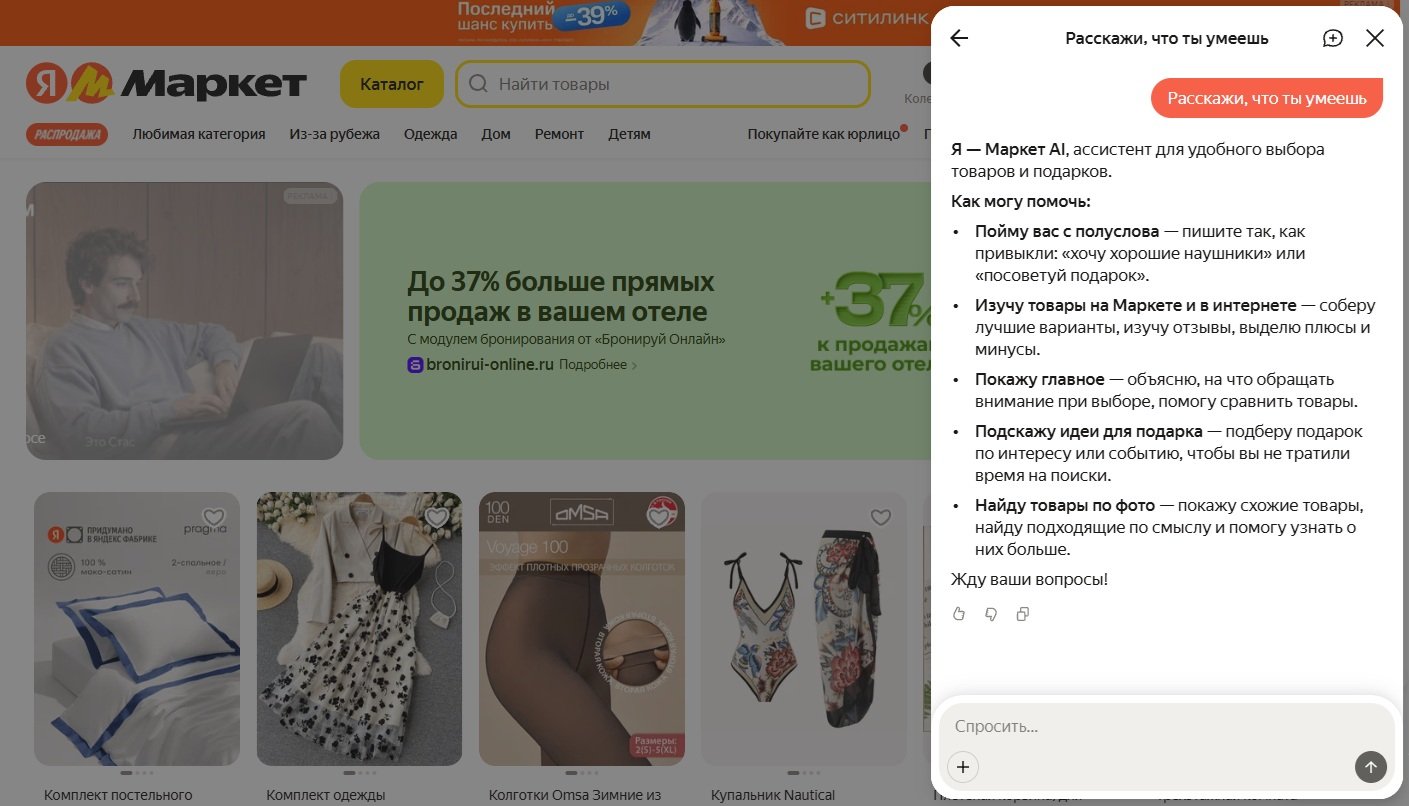 Яндекс Маркет запустил инструмент «Маркет AI» для селлеров — это чат с ассистентом на основе искусственного интеллекта. Он анализирует продажи, помогает составить привлекательные описания товаров и разобраться в работе маркетплейса.