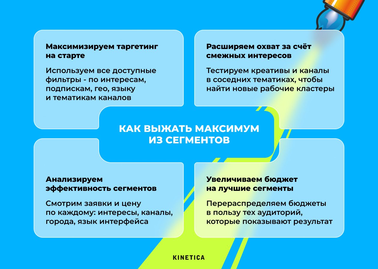 Мы придерживаемся следующей механики: сначала используем максимум доступных настроек таргетинга, чтобы собрать именно нашу целевую аудиторию, а дальше опираемся на факты. Смотрим, какие сегменты (города, каналы, интересы) отрабатывают сильнее остальных по заявкам и цене, усиливаем бюджет именно на них и параллельно подключаем тексты на смежные интересы и близкие по тематике каналы, чтобы находить новые работающие сегменты ЦА и не упираться в один узкий слой аудитории.