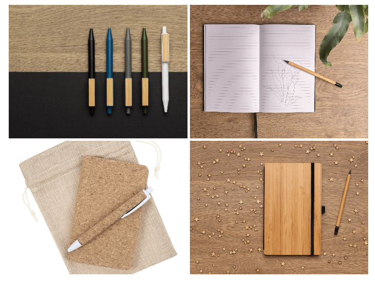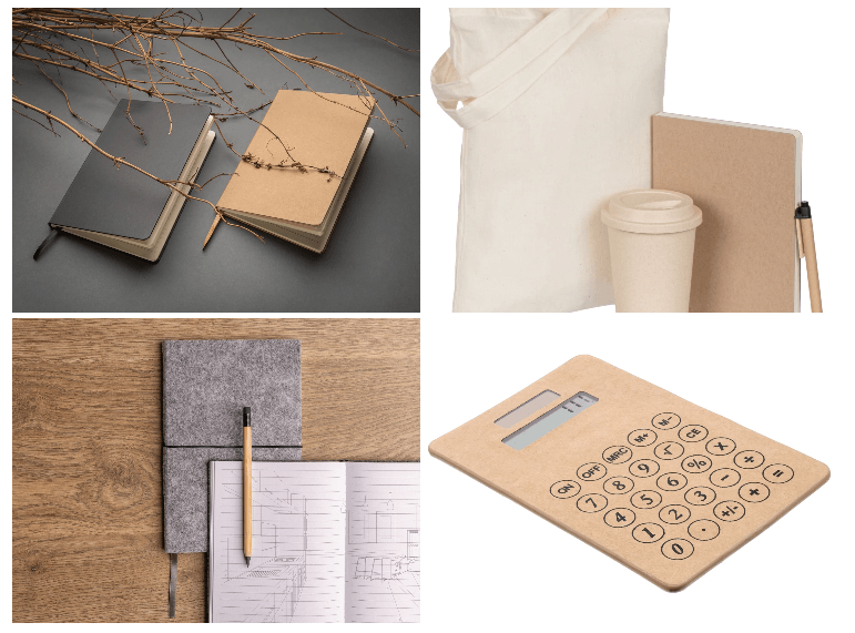 Например, наборы канцелярии типа Corkness: блокнот, холщовый мешок Foster Thank, ручка шариковая Grapho, или блокноты из переработанных материалов FSC® в твердом переплете, ручки из переработанного ABS-пластика GRS с бамбуковым клипом, вечные карандаш из бамбука FSC® с ластиком, комплекты из блокнота и вечного карандаша к нему Bamboo FSC®, блокноты в мягкой обложке из переработанного фетра (стандарт GRS) и даже калькуляторы типа Kraftwerk из крафтового картона. А разместить всё необходимое можно в органайзер Impact из RPET AWARE™ на молнии, А4.