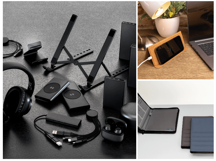 На рабочем месте можно разместить метеостанцию Utah из переработанного пластика RCS и бамбука FSC®, используя подставка для ноутбука/планшета и комплекты беспроводных зарядок, внешних аккумуляторов, кабелей для зарядки, наушники и колонки Terra из переработанного алюминия RCS, а также коврик для мыши Cork с функцией беспроводной зарядки и подставки для телефона.