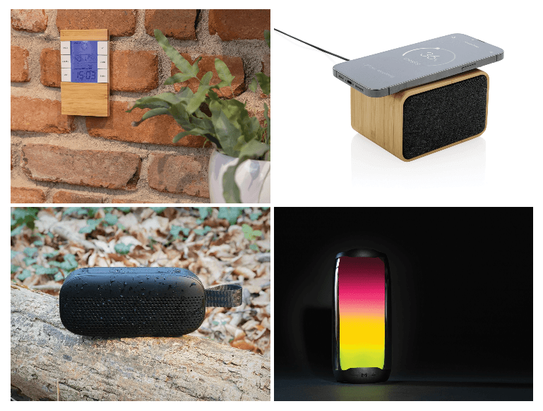 На работе можно окружать себя не только канцелярией: например, настроиться на рабочий лад или отвлечься на несколько минут поможет колонка с функцией беспроводной зарядки (5 Вт) из переработанного пластика RCS и бамбука FSC® или колонка Soundbox из переработанного ABS-пластика RCS, беспроводная колонка Lightboom из переработанного пластика RCS.