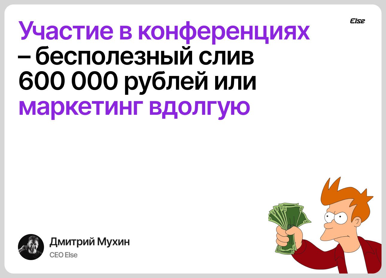 Меня зовут Дима Мухин, я основатель IT-компании Else Digital. Уже много лет я отвечаю за стратегию роста, продвижение и развитие наших digital-продуктов. И долгое время я был уверен, что участие в конференциях, выставках и форумах просто пустой тратой времени и денег.