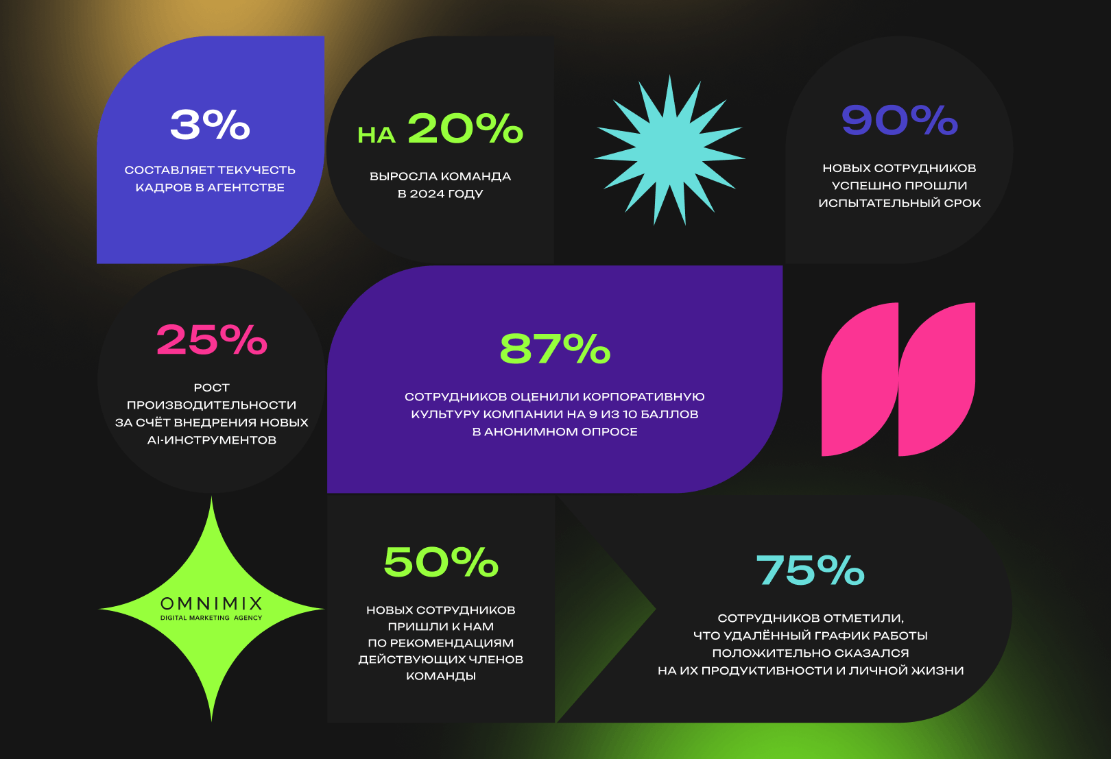 Удаленная работа может быть успешной и комфортной, если внутри компании правильно выстроена корпоративная культура. Мы в OMNIMIX понимаем, что важно не только следить за выполнением планов и задач, но и заботиться о сотрудниках, поддерживать их ментальное и профессиональное развитие. Это помогает сохранять командный дух и добиваться потрясающих результатов.