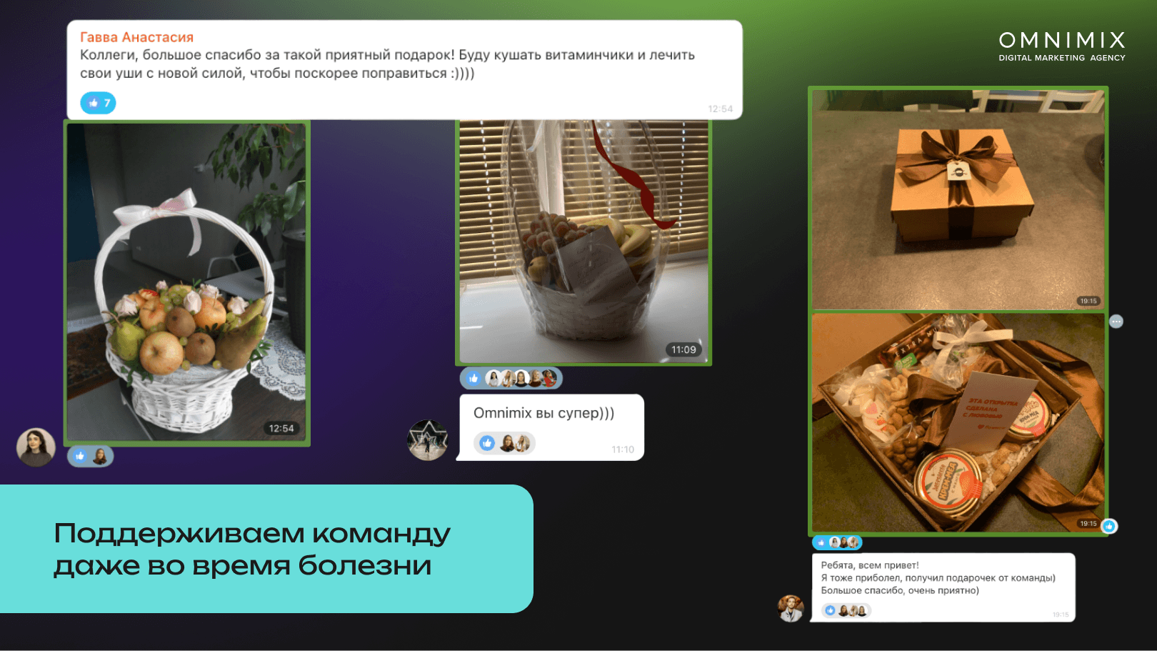 При удаленной работе задача руководства и HR-менеджеров — поддерживать постоянную связь, обмениваться идеями и обсуждать результаты проделанной работы с сотрудниками. В OMNIMIX мы стараемся внедрять это на каждом шагу: отрегулярных онлайн-встреч до «доски почета», на которой мы каждую неделю отмечаем успехи коллег и отправляем каждому виртуальные награды.