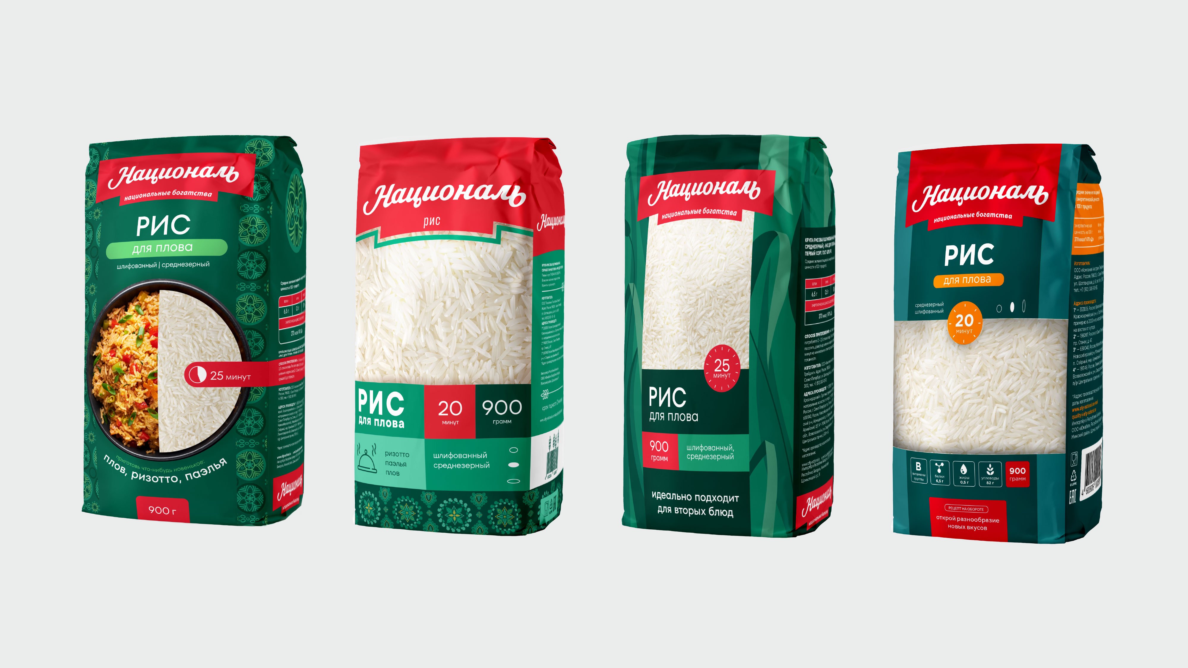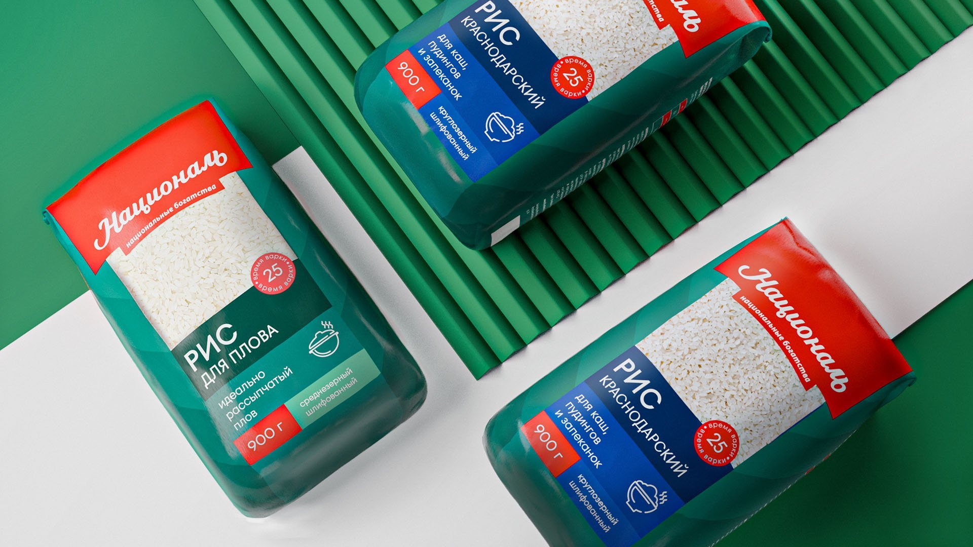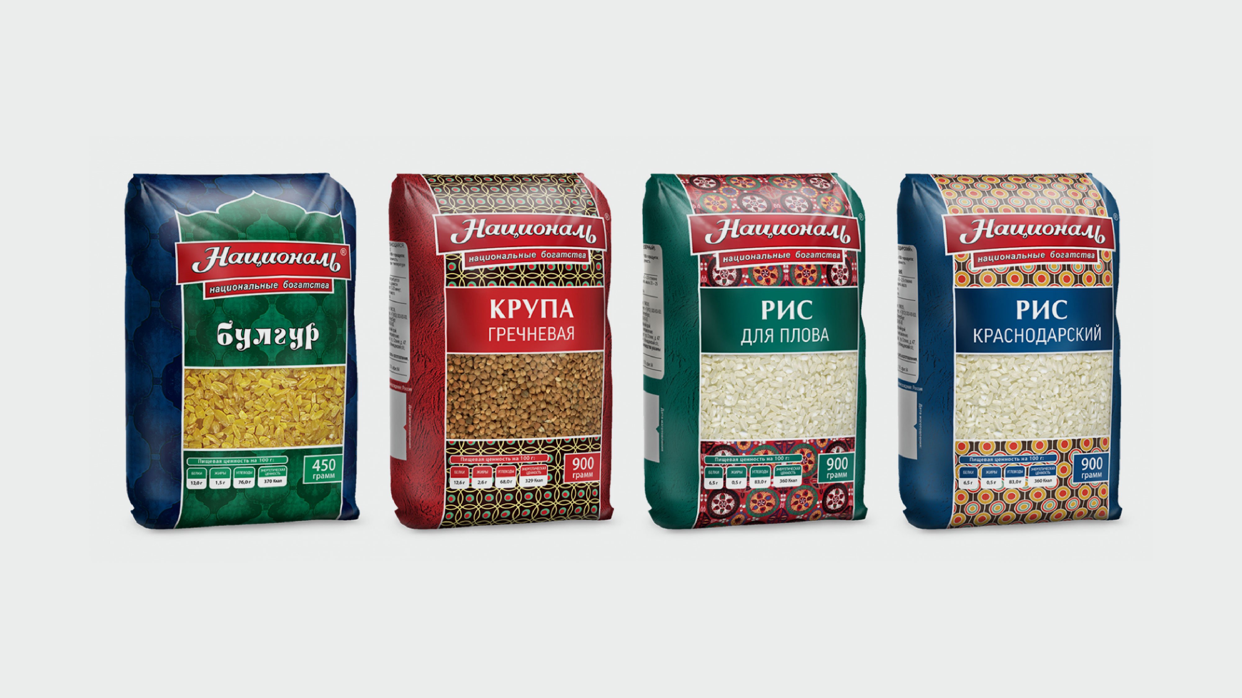 Первый, рациональный пример — проект с компанией «АФГ Националь». Агропромышленный холдинг — лидер на российском рынке круп, крупнейшая рисовая компания России и Европы — пришел к нам за визуальным обновлением своей торговой марки «Националь», в ассортименте которой крупы и большая линейка риса.