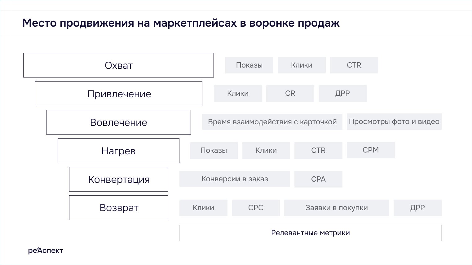 Продвижение на маркетплейсах работает на всех этапах воронки. Инструменты подбираются под цель: охват, привлечение, вовлечение, нагрев, конверсия и повторные продажи. Системная работа формирует доверие, вовлечённость и лояльность к бренду.