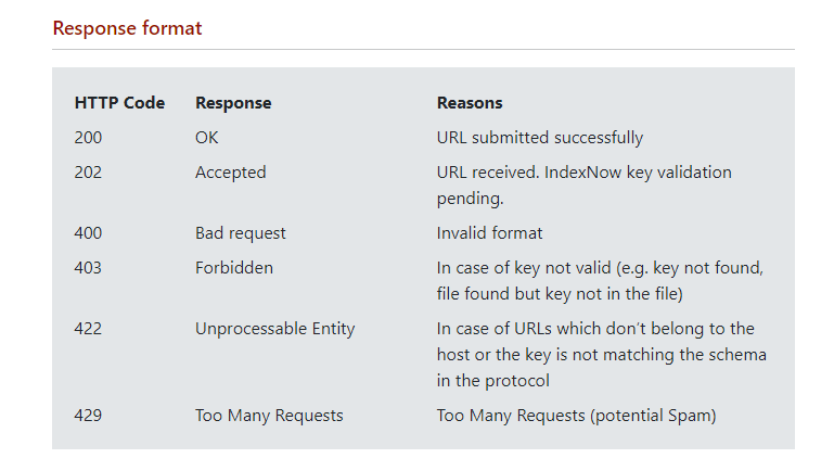 Это независимый инструмент, который сообщает об обновлении или добавлении страниц напрямую в Яндекс, а также Bing, Naver, Seznam, Yep (кроме Google). Индексация происходит без обхода собственных роботов поисковых систем. Правда, добавление в индекс не гарантировано — об отказе поисковики сообщат. Ниже на скриншоте — возможные ответы после отправки страниц через IndexNow.