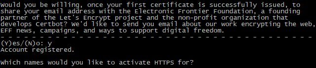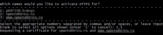 Certbot проверит конфигурационные файлы nginx / apache на наличие доменных имен. Если они будут найдены, то он выведет их список и предложит указать те, для которых требуется получить сертификаты и настроить веб-сервер (в консоли вводятся номера позиций, возможно указание нескольких через пробел). Если же у вас нет настроенных доменов, то имя потребуется указать вручную: