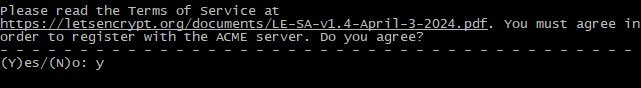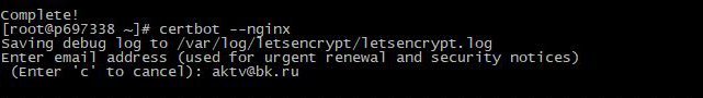 Certbot попросит указать адрес электронной почты, которая будет использована срочного продления и уведомлений безопасности. Указываем свою почту и нажимаем Enter: